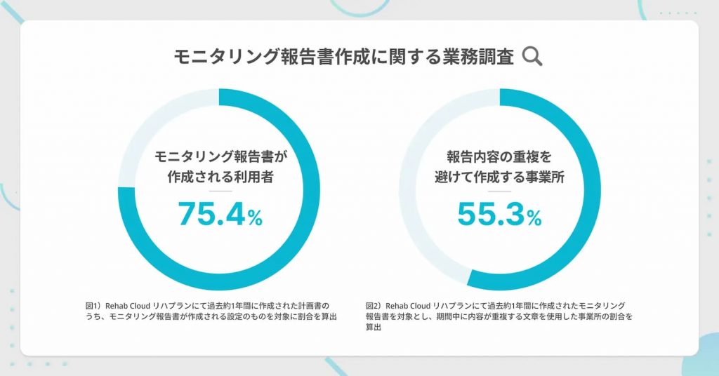 モニタリング報告書は、事業所での利用者様の様子や健康状態をケアマネジャー様に共有し、より適切なケアの提供機会を増やすための重要な書類です。その作成においては、多忙な月末に数ヶ月分の利用者様の記録を振り返り文章化する必要があるため、職員にとって負担の大きい業務となっています。