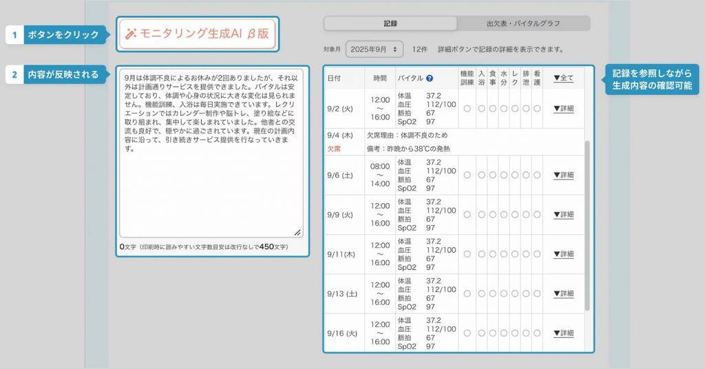 このたび、生成AIを活用した通所介護モニタリング報告書の文章自動作成機能「モニタリング生成AI β版」の提供を開始しましたことをお知らせします。